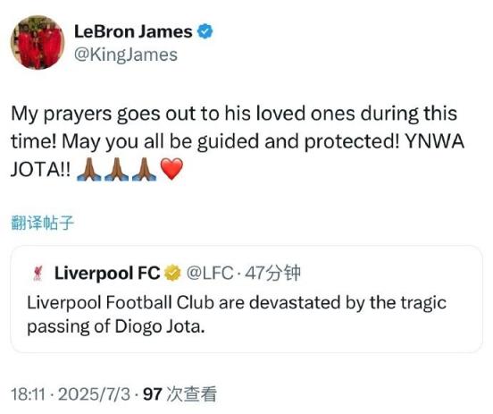 如今在洛杉磯當地時間凌晨3點11,詹姆斯更新社媒悼念不幸去世的若塔:“在這艱難時刻,我的心與若塔的家人們同在!愿你們都能得到指引和庇佑!你永不獨行,若塔!”