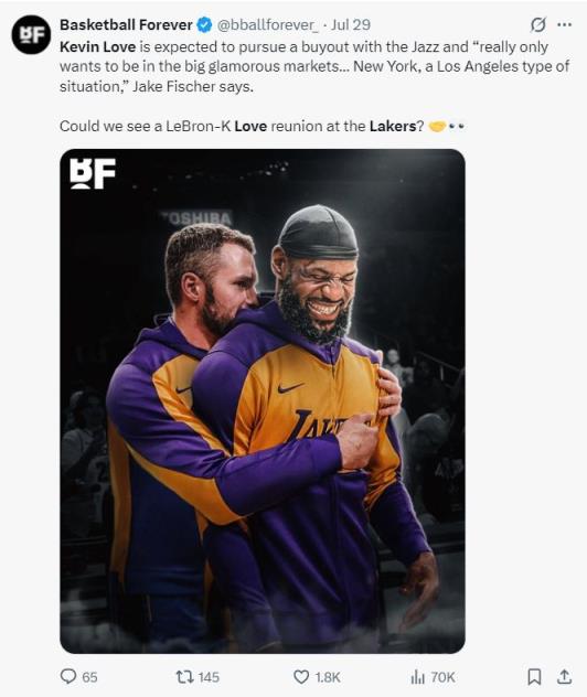 早在上個(gè)月的29號(hào),BR記者杰克-費(fèi)舍爾就透露樂(lè)福一直都在探索離開(kāi)爵士隊(duì)的方式,他希望去一支大球市打球,比如紐約、洛杉磯。當(dāng)時(shí)美媒BF就在暢想36歲的樂(lè)福與40歲的勒布朗在LAL重聚的場(chǎng)面。