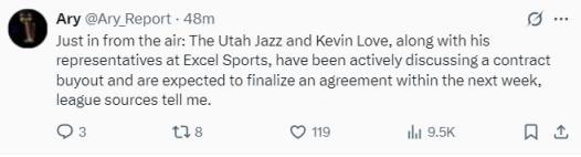 隨后美記Ary爆料,剛剛得到消息,猶他爵士隊(duì)與凱文-樂(lè)福及其所在的Excel Sports經(jīng)紀(jì)公司一直在積極商討合同解約的事宜,他們預(yù)計(jì)將在未來(lái)一周內(nèi)達(dá)成協(xié)議。