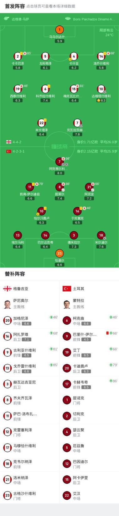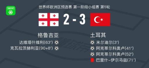 北京時間9月5日,世界杯歐洲區預選賽第一階段小組賽第5輪,格魯吉亞與土耳其展開對決。比賽開始后不久,土耳其球員居萊爾送出助攻,米爾迪爾為球隊首開紀錄。隨后在上半場結束前,阿克蒂爾科奧盧接隊友傳球冷靜破門,將比分擴大。下半場易邊再戰,阿克金精準傳球助攻阿克蒂爾科奧盧再入一球,完成個人梅開二度。第63分鐘,格魯吉亞球員達維塔什維利抓住機會扳回一城。隨后土耳其球員巴里什-伊爾馬茲因犯規動作過大被紅牌罰下,局勢發生變化。比賽臨近結束階段,格魯吉亞球員克瓦拉茨赫利亞在補時階段打入一球,但最終未能扭轉局勢。全場比賽結束,最終比分格魯吉亞2-3土耳其。