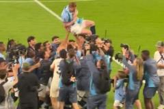 別給摔傷了德布勞內正搭著妻子繞場時,被隊友攔截舉起