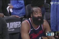 拼了一整場!最后時刻等待裁判宣判時,哈登在板凳席相當疲憊,雙眼無神呀!